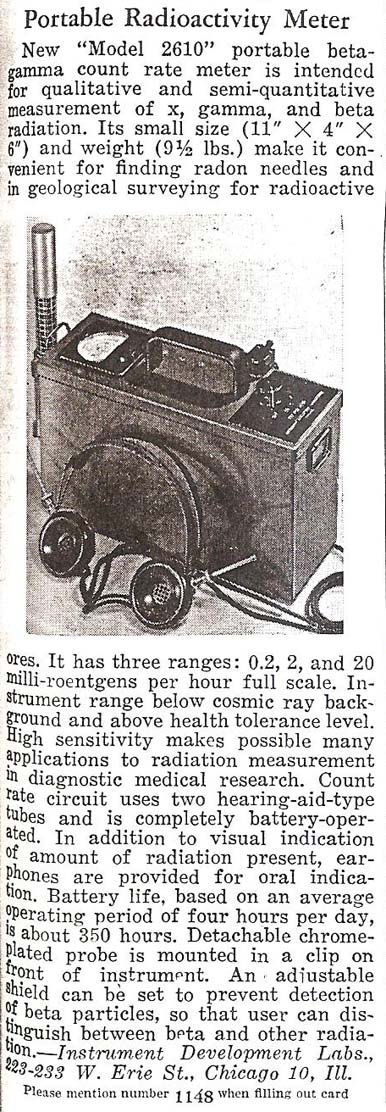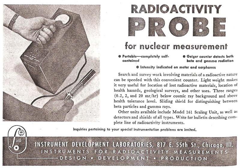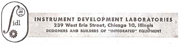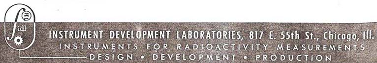Instrument Development Laboratories (idl) was located at 817 East 55th Street, Chicago, Illinois in February 1946. James A. (Jim) Schoke1, a pioneer in nucleonics, was founder and President and was joined by John Kuranz and Tom Mitchell to make laboratory counting scalers for nuclear instruments. They were all previously in the Army Special Engineering Detachment of the Corps of Engineers and worked on the Manhattan Project at the Metallurgical Laboratory (Met Lab) at the University of Chicago during WWII. In 1947, the company moved to 223 West Erie Street in Chicago, Illinois. The first two instruments developed were based on Manhattan Project designs - one was a laboratory scaler with power supply for Geiger counters (Model 161) and the second was a portable Geiger counter (Model 2610) survey instrument. The Model 161 was followed by the Model 162 which added a preamplifier for use with proportional counters. These instruments remained very popular in the late 1940's and early 1950's. The company motto was “Instruments for Radioactivity Measurements: Design – Development – Production". idl later became Nuclear Instruments & Chemical Corporation in 1948 and then Nuclear-Chicago in 1954.