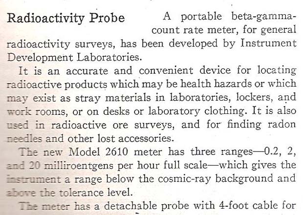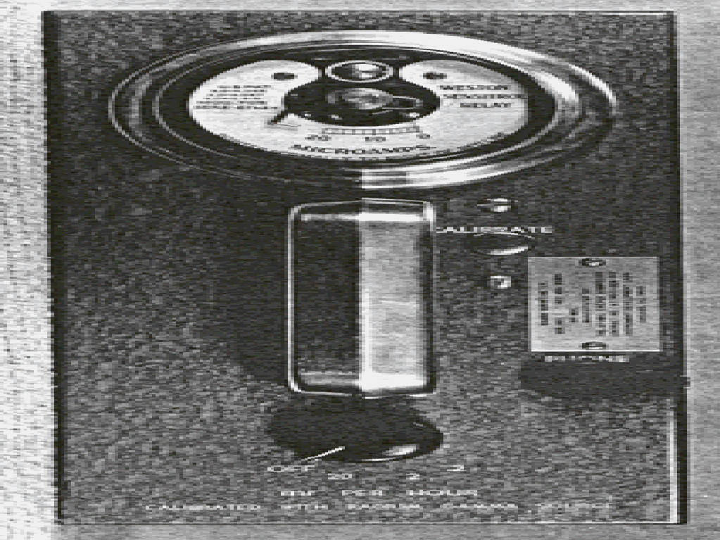The Model 2610 was used at the Los Alamos Scientific Laboratory in 1947. It was manufactured for the AEC for use in the Manhattan Project. The meter had a 20 microampere range and a scale selectable for 0.2, 2 and 20 mR/h. The micro-amp meter was unusual in that it increased from right to left. The Model 2610 was modified in July 1948 at Los Alamos to include a buzzer for easier identification of radioactive sources.