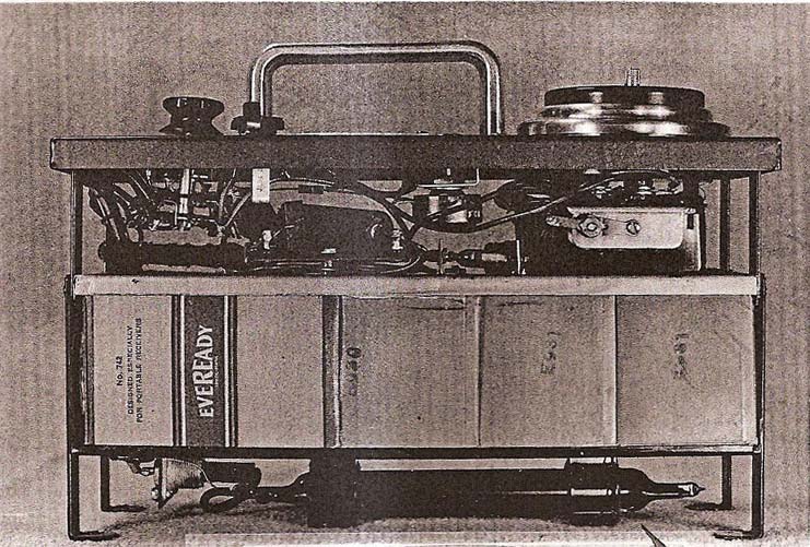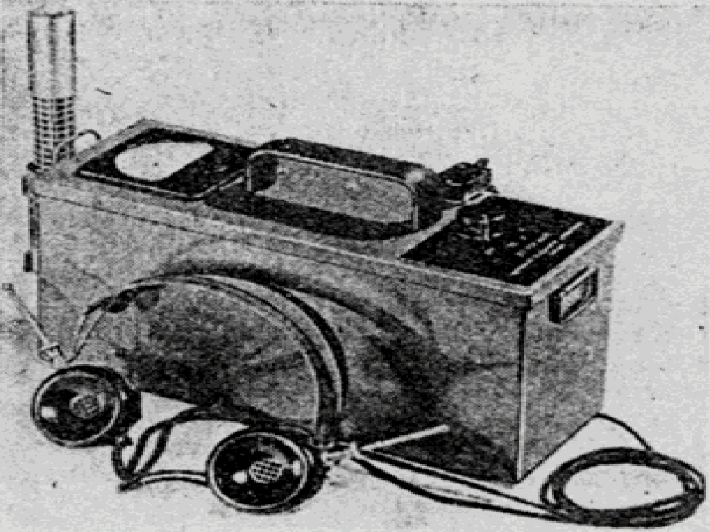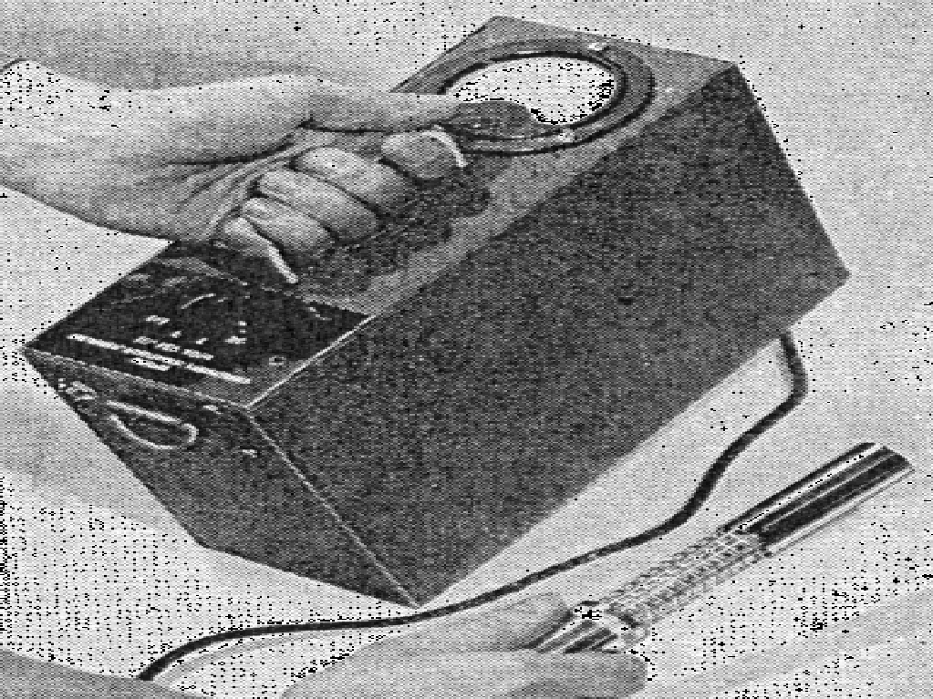 In 1947, the lab developed the Model 2610 which was a portable beta-gamma count rate meter. It could be used to find radium needles and conduct geological surveying for radioactive ores. The unit sold for $250 in 1948. The Operation Sandstone report from 1948 indicates that 25 of the units were evaluated for use in atomic tests at Kwajalein Island, South Pacific. The unit was 11” x 4” x 6” and weighed 11.5 lbs. The probe, detachable with a 4' cable, was 9” long x 1.25” diameter and contained a gas of neon and ethyl ether. It had three decade ranges from 0.2 to 20 mR/h. The unit used two hundred 1.5-volt batteries in a fist sized box to give 300 volts (made with 10 stacks of flat cells). The 1.5 volt batteries are made with flat square cell construction technology which uses plasticized sealing materials as compared to bulky metal cans. By adding 3 battery packs in series, one can achieve the 900 volts required to power the Geiger counter tube. It comes with a double receiver headset for rapid surveying operations.