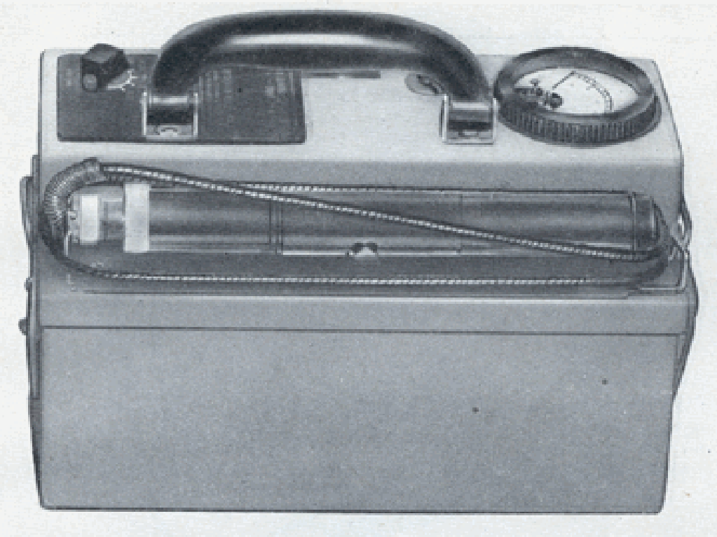 The Model MX-5 (IM-39/PD) was a portable beta-gamma count rate survey meter with a thin-wall glass GM tube in an external probe available in 1948. It was 9.25 x 4-5/8 x 5-1/4 and weighed 9 lbs. The probe was 8 x 1 with a 30 cable. It had full scale sensitivity for beta from 1000, 10000 and 100,000 cpm and gamma from 0.2, 2 and 20 mR/h. The beta shield is 1/32 brass. It could detect betas down to 205 keV. It has a smooth gray hammertone finish case with metal parts plated in chrome to resist salt water corrosion and had a hinged smooth plastic handle.