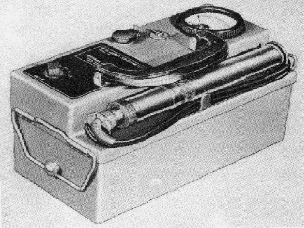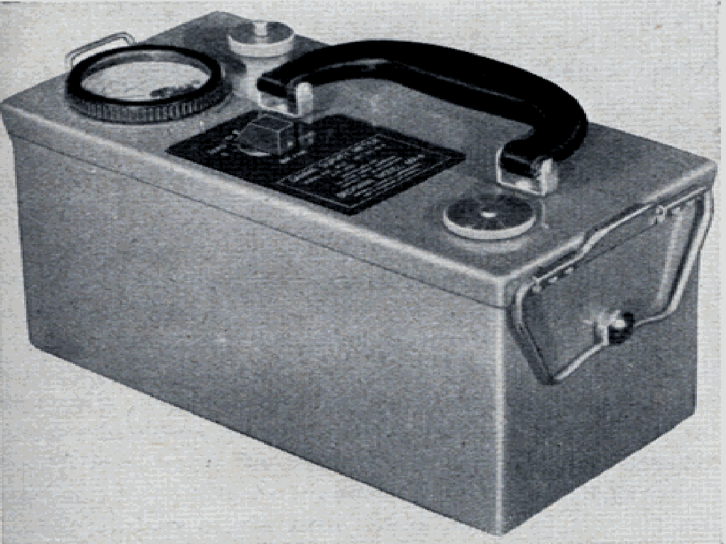 The Model MX-6 (IM-40/PD) was a portable gamma ionization rate meter with a built-in, sealed ionization chamber in 1947. It weighs 8 lbs. It had ranges from 5, 50, 500 and 5,000 mR/h. The chamber is made of copper, lined with aquadag with a 0.5 liter volume. It is filled with freon #22 at 4 lbs. The case is welded aluminum with a hammertone finish. It used four 1.5, one 3, and six 22.5 volt batteries. The unit was 9.5 x 4-7/8 x 6 and weighed 8 lbs.