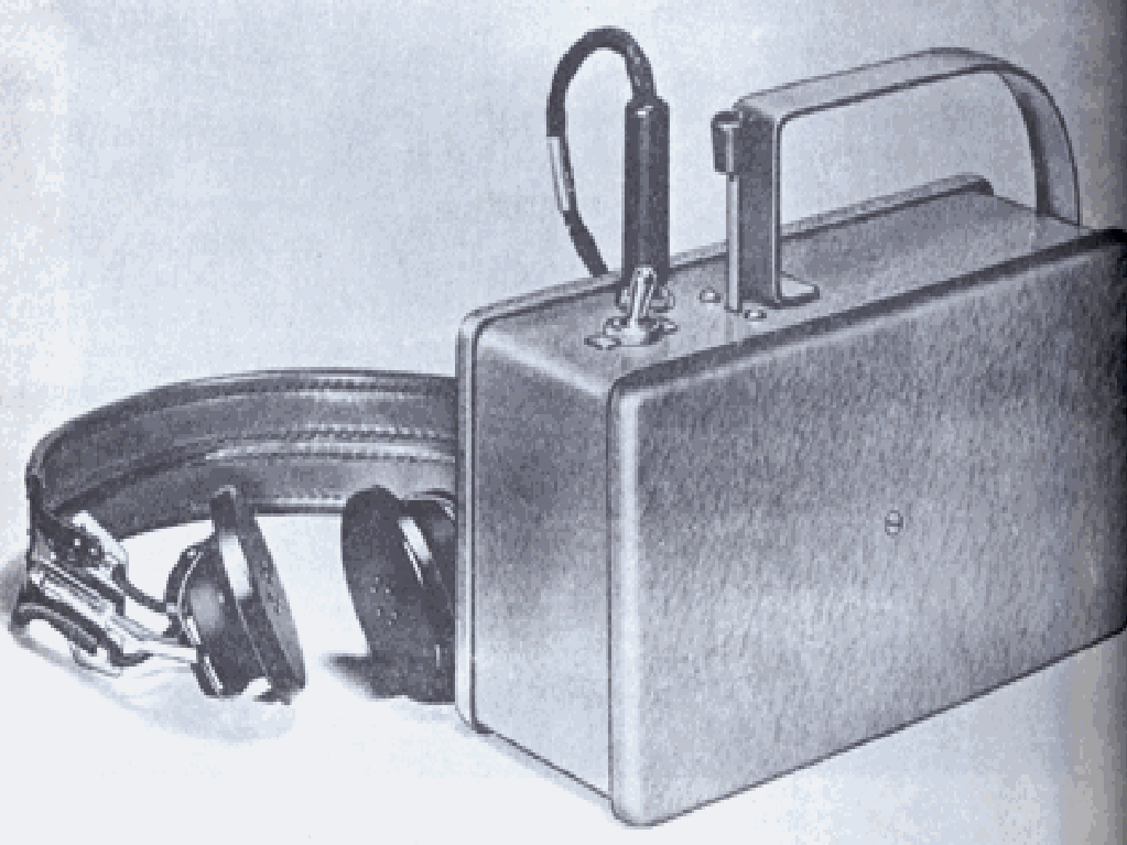 The Model MX-8 was offered in 1949 as a lightweight, portable detector for prospecting for radioactive ores. The unit is 7.75 x 4 x 2.75 and weighed 3.25 lbs. It could detect beta and gamma with an internal Geiger counter tube. It used one 300, one 22.5 and one 1.5 volt batteries. The condensers to power the Geiger tube were charged using a push button switch. It had headphones for audio detection.