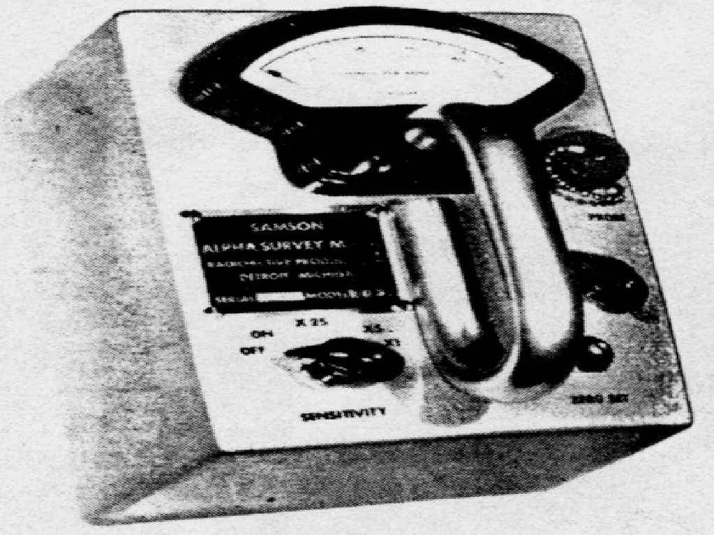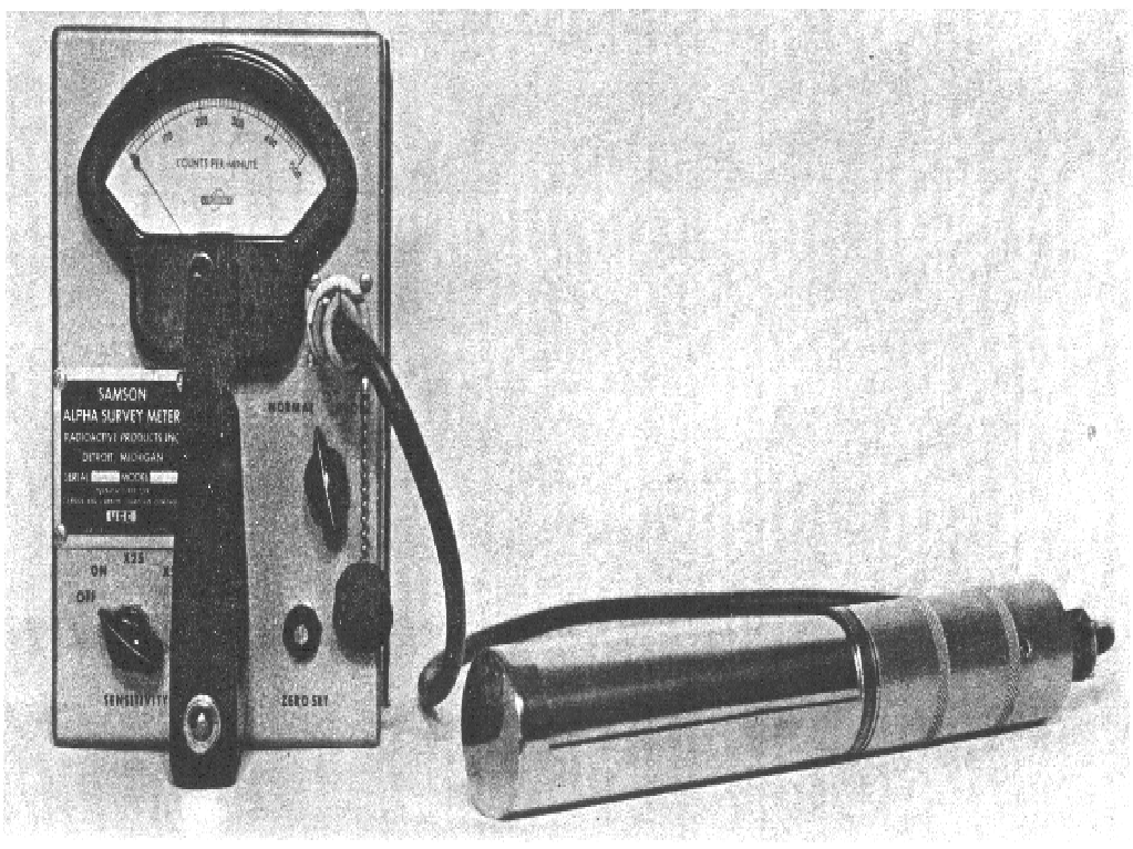 The Samson alpha survey meter was developed in the 1950's. It has an internal air ionization chamber and some units came with an optional auxiliary probe for beta and gamma monitoring. It had three ranges x1, x5 and x25. It was 8.25” long x 5-1/8” wide x 7.25” high and weighed 5 lbs. The chamber is sensitive to alpha, beta and gamma but only calibrated for alpha.