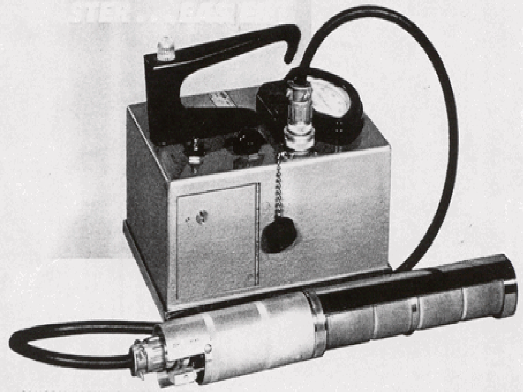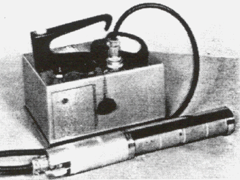 The model D-5A probe, available in 1952, was an optional beta-gamma probe which is shown in the picture. The probe contains a freon-filled ionization chamber with a rotating stainless steel shield for beta discrimination. The probe extends the Samson range from 0.25, 1.25, 6.25, 25, 125 and 625 mR/h. A D-5B probe was also offered. When using both probes, it was possible to detect low level alpha contamination up to 625 mR/h gamma. The instrument could be used to monitor flat and irregular surface, holes and corners. Included is a metal plug-in battery box, a roll over bottom stainless steel screen to minimize contamination traps, and a flashing light to indicate unit operation.