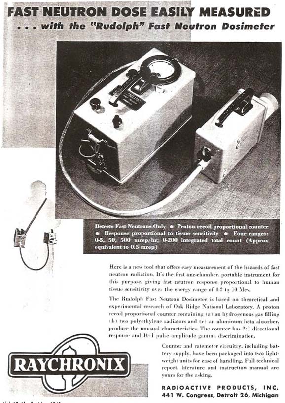 The Raychronix “Rudolph” Fast Neutron Dosimeter Model E-1 was offered in 1952. It was sensitive to 0.2 to 10 MeV neutrons. It was a dosimeter designed to measure dose rate directly, even in a large gamma-ray field. The unit detects fast neutrons only. It uses a proton recoil proportional counter. The response was proportional to tissue sensitivity. It had four ranges 5, 50, 500 mR/h and 0-200 integrated total count, about 0.5 mR. The levels are based theoretical and experimental research at Oak Ridge National Laboratory. A proton recoil proportional counter containing (a) a hydrogenous gas filling (b) two polyethylene radiators, (c) an aluminum beta absorber, produce the unusual characteristics. The counter has 2:1 directional response and 10:1 pulse amplitude gamma discrimination. It is package in two lightweight units with combined weight of 10 lbs. for ease of operation.