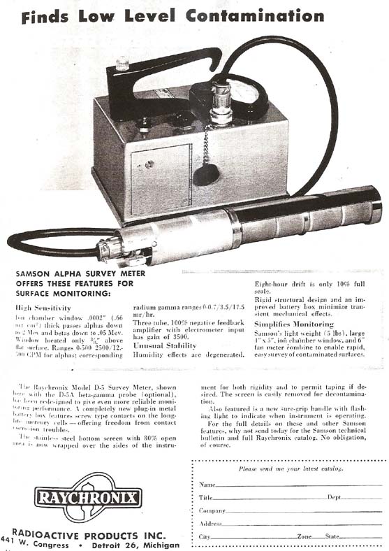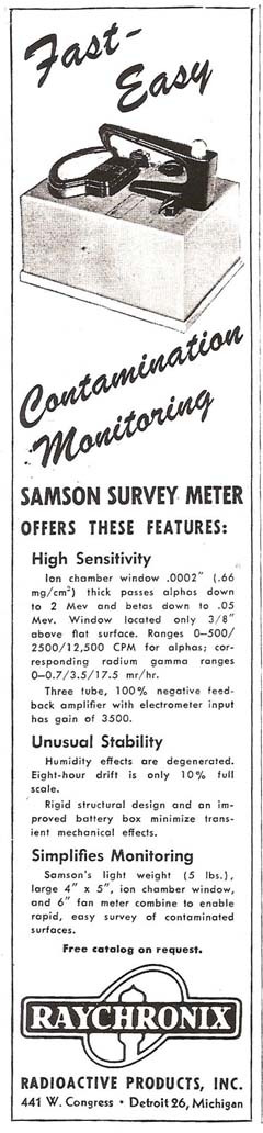 The Raychronix Model D-5 Samson Alpha survey meter was introduced in 1953 for locating low level contamination. The Sampson was named after the Biblical hero or possibly an acronym for “son of standard alpha monitor”. It was advertised as “fast-easy contamination monitoring”. It had an ion chamber window which passes alphas down to 2 MeV and betas down to 0.05 MeV. Ranges were 0-500, 2500 and 12,500 cpm for alphas. Corresponding radium gamma ranges were 0.0.7, 3.5, and 17.5 mR/h. It advertised an 8-hour drift of only 10% full scale. It weighed 5 lbs., had a large 4”x5” ion chamber window, and 6” fan meter. The bottom of the unit had a stainless steel screen with 80% open area. It was designed for ease of decontamination where the screen could be removed.