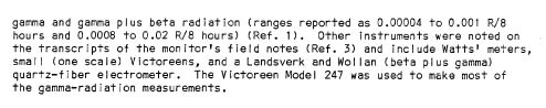 Equipment used for off-site monitoring consisted of a methane filled proportional counters for alpha detection, Victoreen Model 247 portable gamma ray survey meters with three ranges, and Hallicrafter Model 5 portable Geiger-Mueller survey meters. In addition, the Landsverk and Wollan quartz fiber electrometers were used at some locations as well at Watts meters.